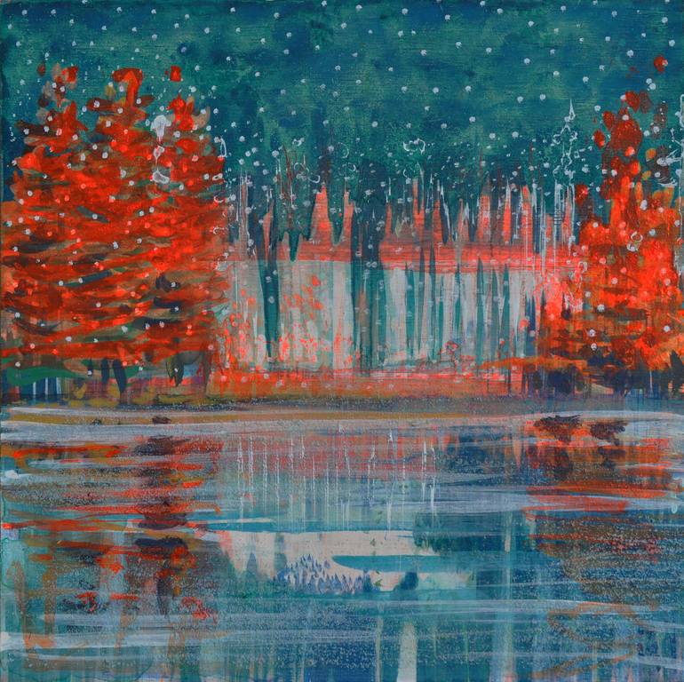 Christmas atmosphere..winter atmosphere cold and warmth red and green..landscape from my imagination Nous pouvons voyager dans des "petits formats" I find small paintings can also make one enter in an other "world"