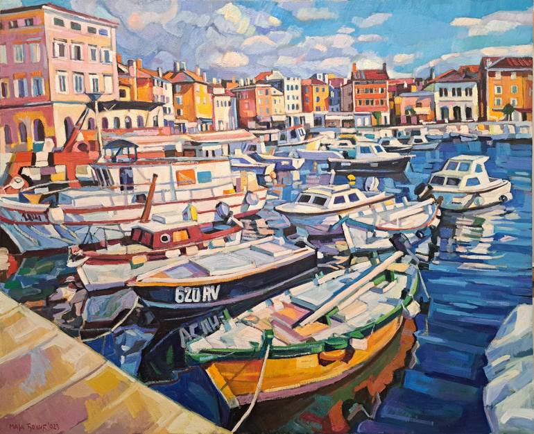 Winter day in Rovinj is a large-format painting made on linen canvas. Rovinj is a beautiful Mediterranean town in Istria (Croatia). The painting shows a harbor with fishing and tourist boats surrounded by town houses. The winter day is sunny, and the blue of the sky flows into the sea, and the h...