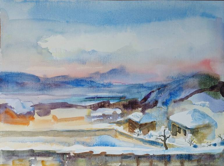 This is the view of my window. I can see how snow evaporates and turn into fog down the valley near the lake. With its subtle colours this landscape fits modern or other style interior.