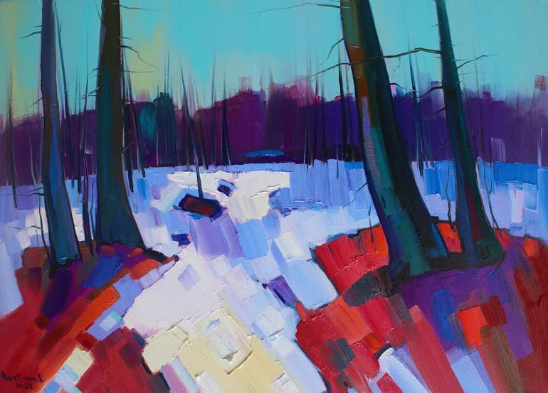 Winter landscape Original artwork This oil landscape painting is unique, this is not print and not copy. Signed on the front side and accompanied by a Certificate of Authenticity. This painting will be send stretched .It's completely ready to hang on the wall.