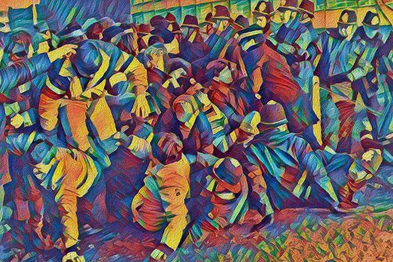 Taken from the series Winter of Discontent, The Scabs was inspired by memories of growing up in the 1970's during the frequent strikes and battles between workers and the police. Painted in oil, the painting exudes the disconnect between workers and the government during the era. Paul’s style embod...