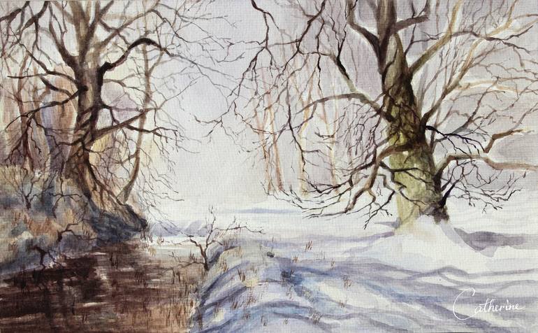 Watercolor landscape painting, 32 x 20 cm. One of the most Beautiful Seasons of the Year when the trees and everything around you gets covered with this beautiful white blanket with thousands and thousands of diamonds and stars, reflecting so brightly in the Sun, sparkling and shining so brightly an...