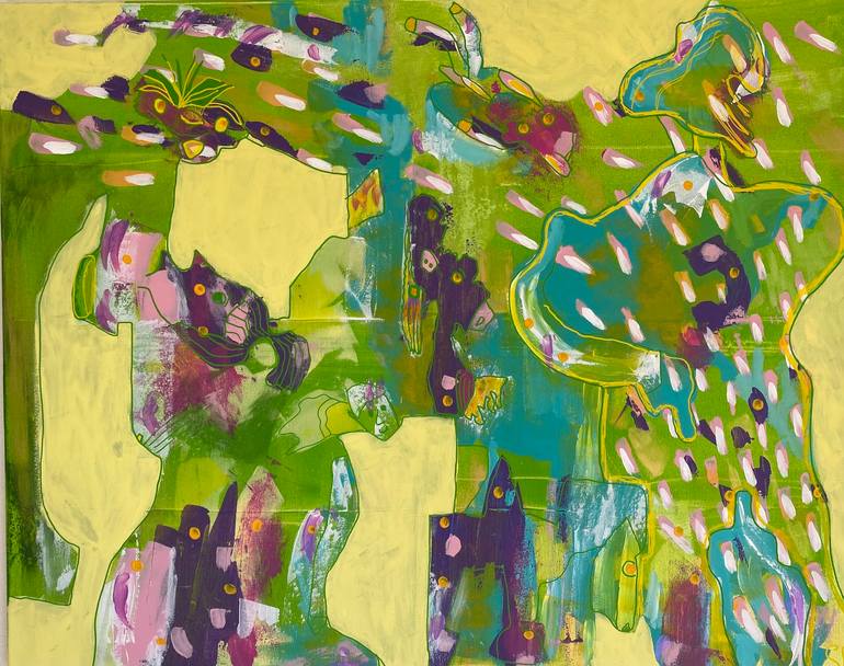 With my art I want to make you smile. My paintings radiate joy and ease. Together with the stories I write for the big formats they stimulate your fantasy and invite you to step into my playful world. (Mit meiner Kunst möchte ich Sie zum Lächeln bringen. Meine Bilder strahlen Freude und Leichtigkeit aus. Zusammen mit den Geschichten, die ich für die großen Formate schreibe, regen sie Ihre Fantasie an und laden Sie ein, in meine spielerische Welt einzutreten.) Hello, I am Suraya Baumeister, born and raised in Heidelberg (Germany) in 1976. I studied landscape architecture in Kassel and Palermo and after living in Karlsruhe for a few years, I moved to Switzerland, to Lake Maggiore in 2010. During my studies (1997-2004) I started to paint abstract, preferably with a spatula. My individual painting style started to form in 2017. The abstract paintings I do are acrylic/mixed media on canvas. I paint them intuitively. Through the abstract painting I get inspired to draw the faces, figures, mythical creatures and elements. What stories do you see in the paintings?