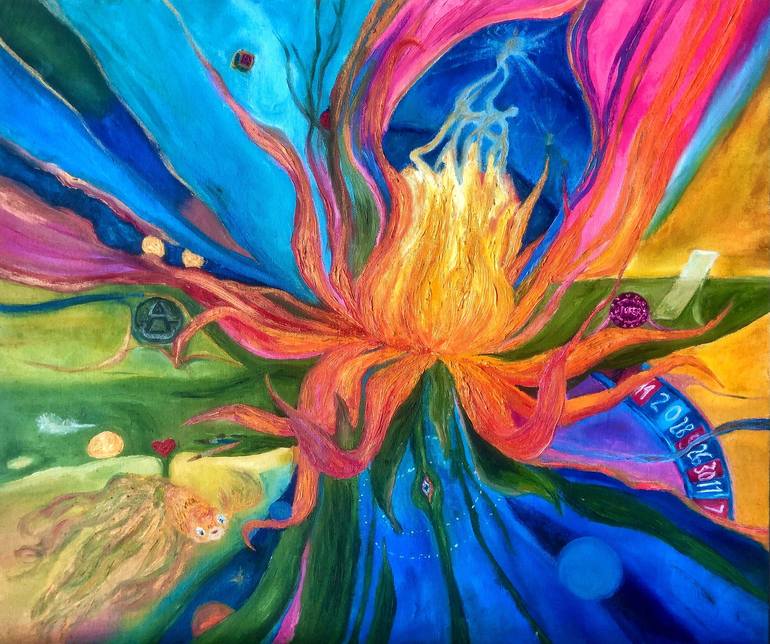 This painting is a vibrant and surreal composition, filled with symbolism and energetic movement. The central focus is a fiery, blooming flower-like structure that radiates outward. There are multiple elements woven into the painting, such as a human figure, a roulette wheel, a clock, and abstrac...