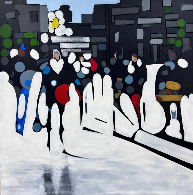 In the moment is based on video footage of a high street. Using a photographic effect called Bokeh the figures are abstracted and stylised creating a paired down silhouette with pops of Mondrian inspired colour. Oil on Canvas the piece is a metre square deep canvas.