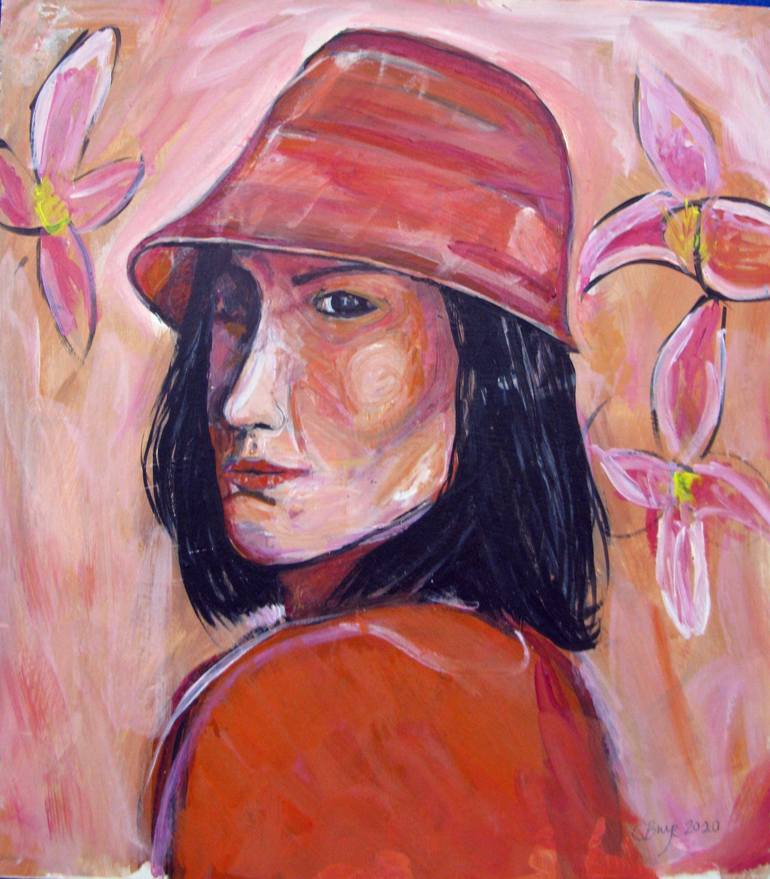 This is an acrylic painting on wood. The woman is looking back over her shoulder at the viewer. It is one of a small series of painting of heads exploring colour and form. It is highly coloured and decorative with a floral background