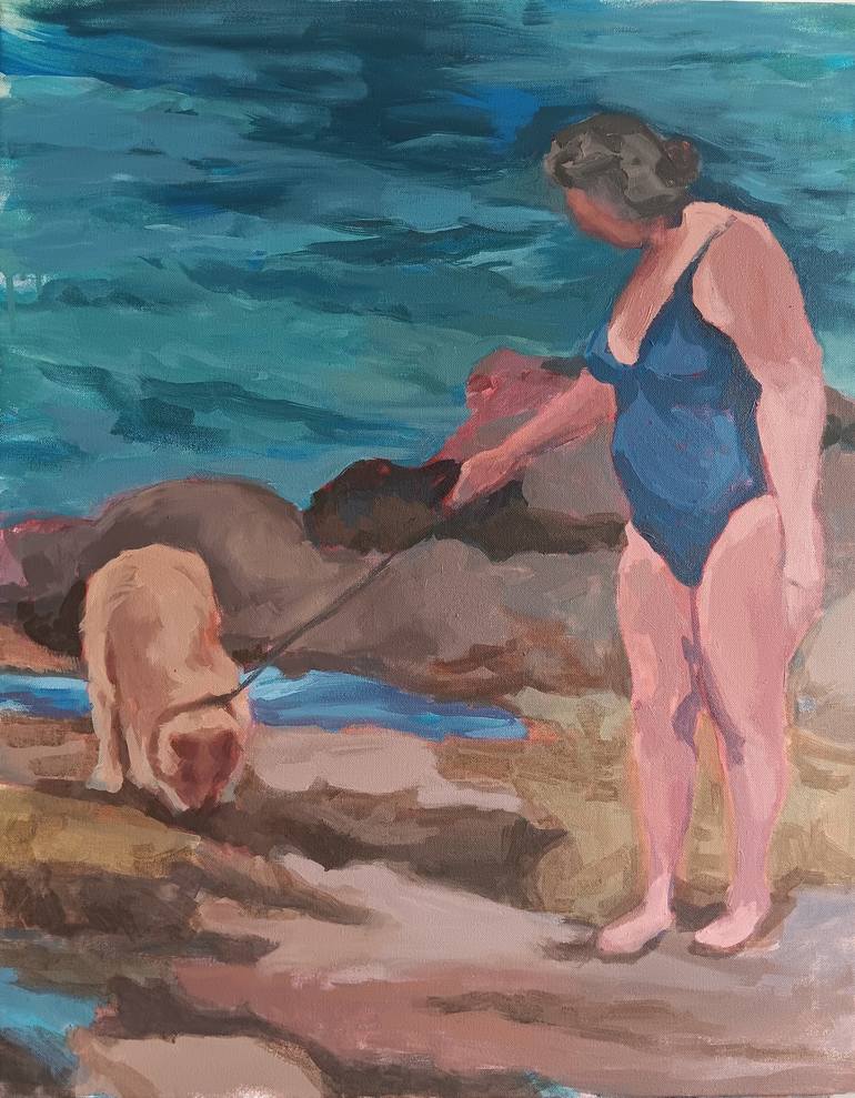 This work inspired by hot Australian summers. Inspiration taken from a trip out to the the beach, taking a swim with pet dogs. Hopefully the viewer identifies with the joy of visiting the great outdoors. The work is painted in oil on canvas a very expressive medium.