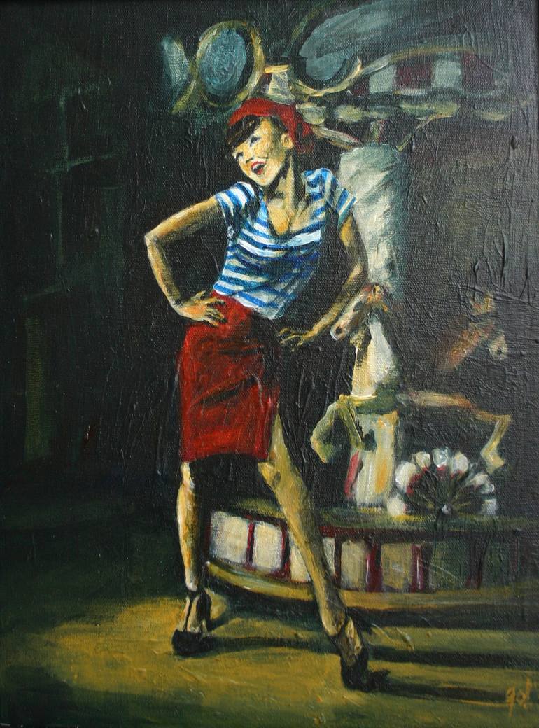 I have made this painting for the collection 'Between Art & Kitsch'. It is a fun painting with a bit of nostalgia. It reminds of the 1920s and looks a bit like a pin-up. In the background is a bit of the carnival showing. The body of the pretty girl takes most of the light. It makes the blue and red...