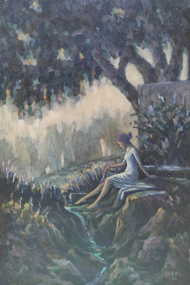 A small work of art treated with rather grayish blue colors. It is inspired by the youth of a woman who delicately touches the water with the tip of her foot. The blurred edges also evoke that ephemeral sense of youth.