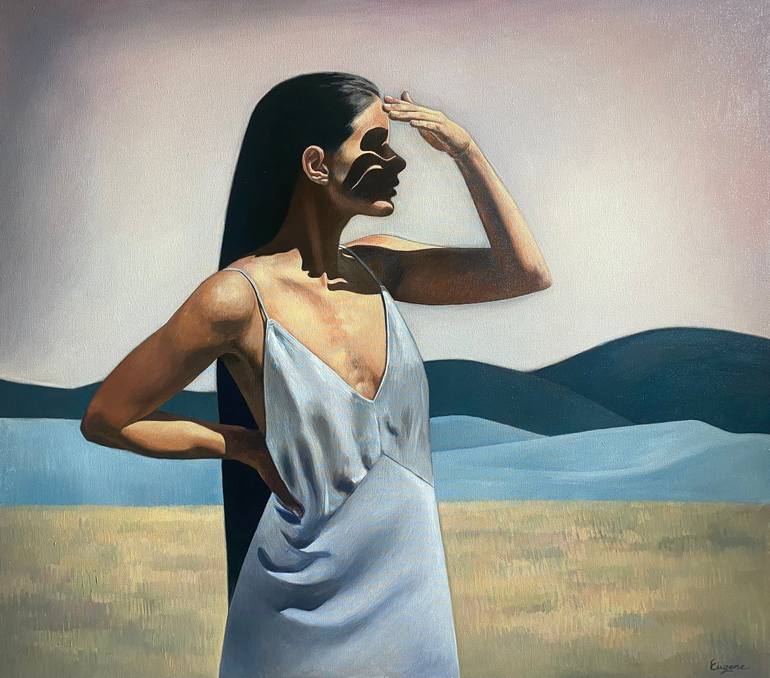 With this painting I wanted to convey the presence of a person in space. How it feels to us. The hand raised above the face creates a shadow by interacting with particles of light, although they are waves. They also lie on her body in waves. Dress as waves. The air, as a form consisting of waves, is...