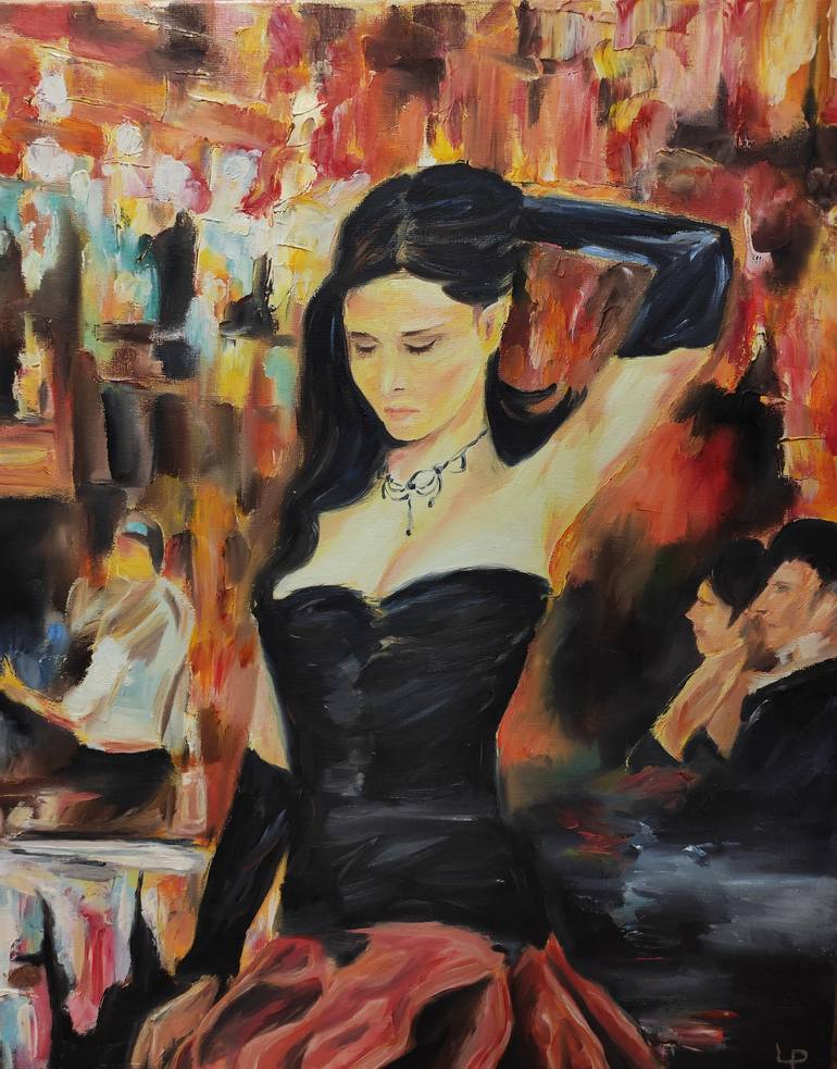 The picture was painted after visiting a jazz bar. Inspired by the soloist of the group. Lots of bright paint and light. The dynamic plot of the picture will look great in a bar, recreation room, hotel. The picture was painted with high-quality oil paints, solvent, oil. The picture is painted on a t...