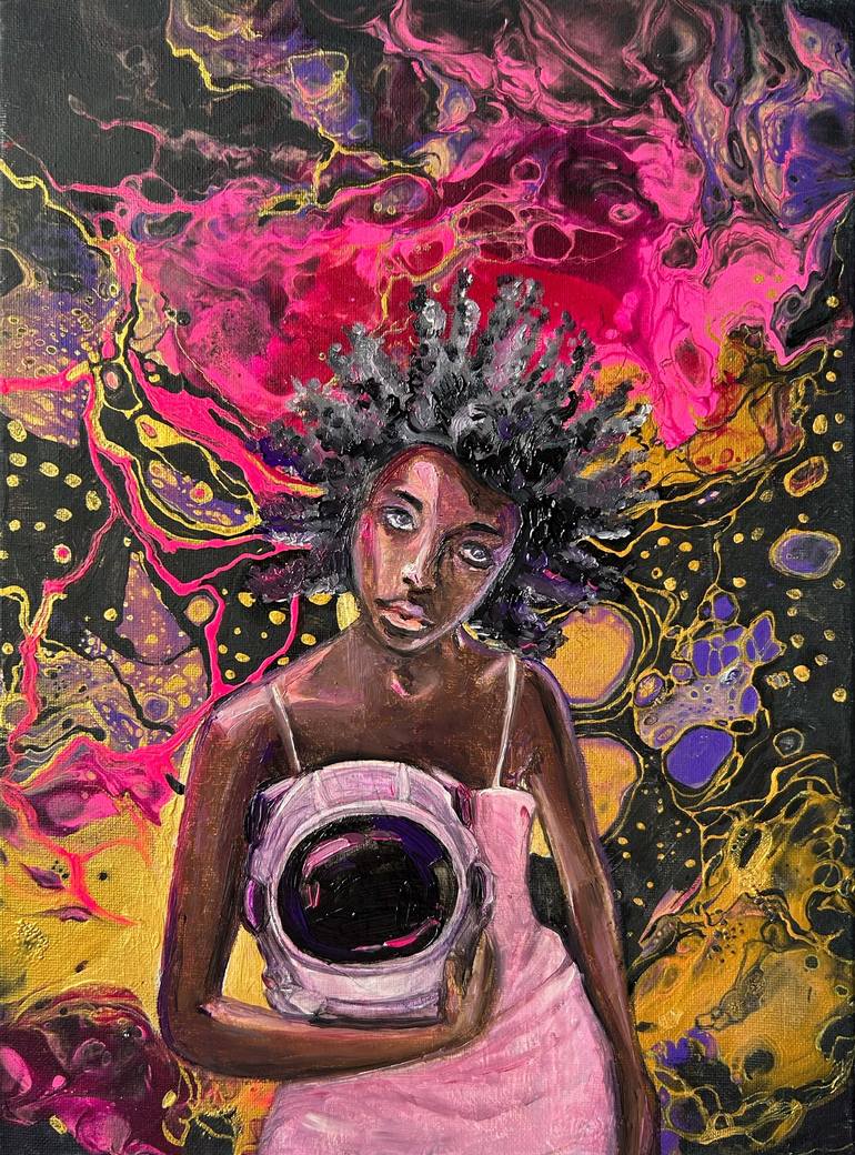 Afrofuturistic painting. An oil painting of a black woman in space on an abstract acrylic background in vibrant pink, black, and gold on a 30x40 cm stretched canvas that is ready to hang. Acrylic varnish is applied to the artwork to preserve the colors and improve their intensity. Please be aware th...