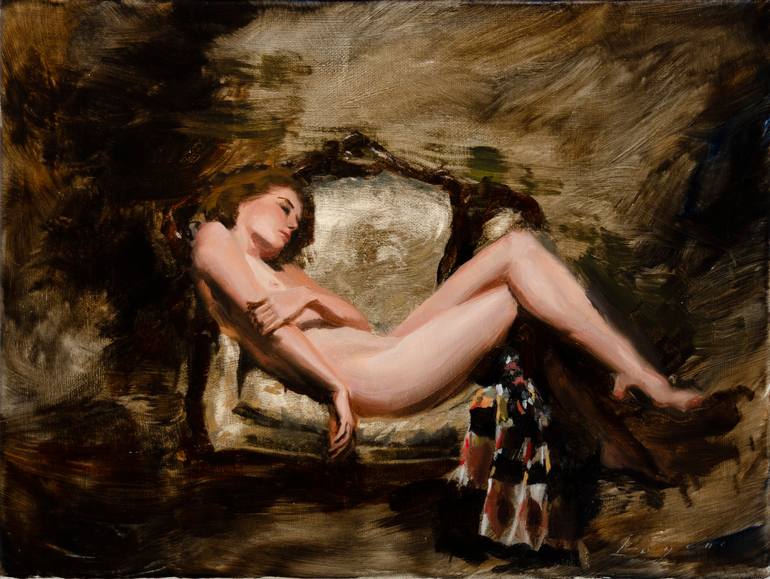 Peinture à l'huile d'un nu Féminin, réalisé dans un mélange de réalisme et d'abstraction. Unique en son genre ! Réalisé par Romain Eugène.