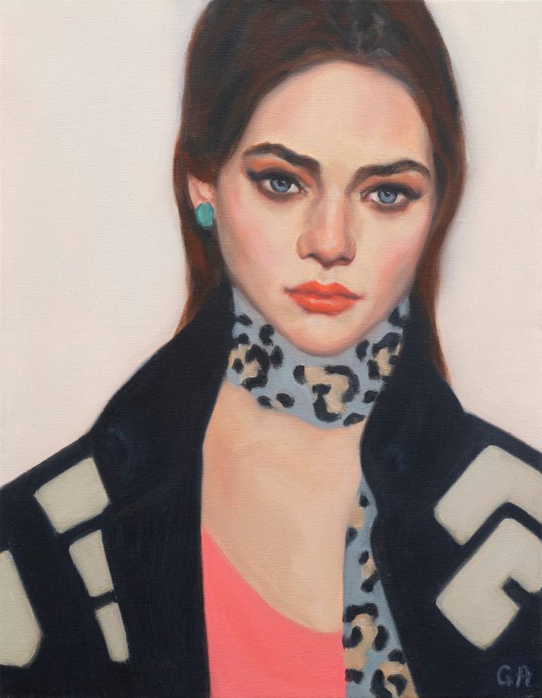 Oil painting on canvas, a portrait of a young beautiful fashionable woman with a leopard print scarf and a stylish jacket. The painting is ready to hang with hanging hardware attached to the back of the painting.