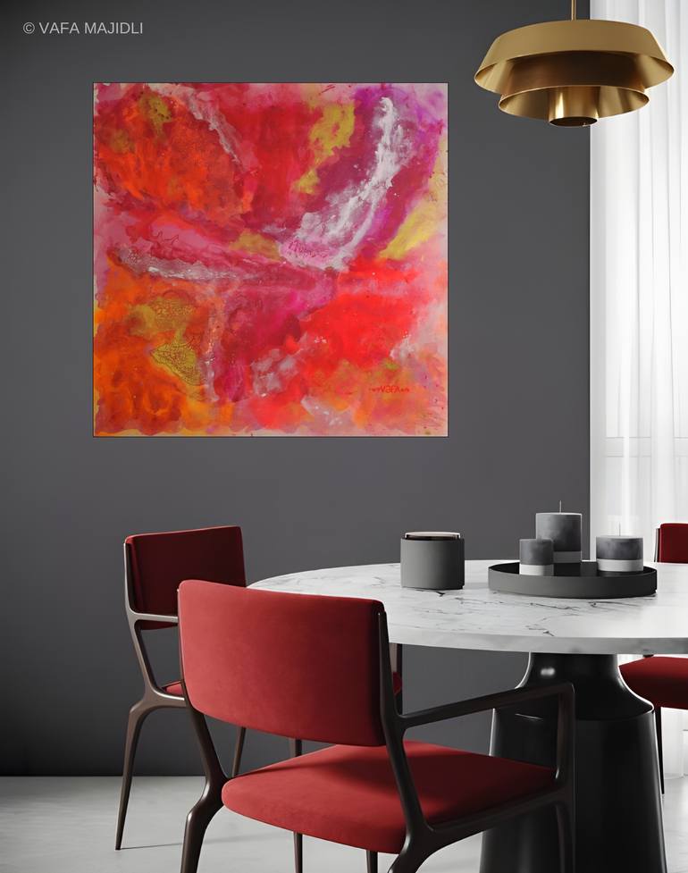 "Womanity" is a masterful fusion of vibrant colors and ethereal textures, transporting the viewer to a realm where femininity reigns supreme. The dominant hues of red, orange, and gold evoke the fiery passion and unyielding strength of the female spirit, while the soft pink and purple undertones whi...