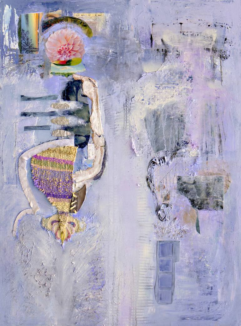 Women Hold Up Half the Sky is a painting about feminism and women's place in society. The left side is an abstracted female figure created by incorporating part of a hand weaving I created, a vintage textile that I embroidered of the woman's ovaries. The right side of the painting is an abstracted ...