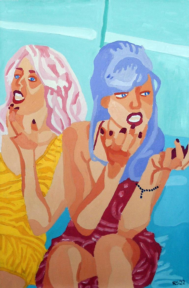 Two women putting on makeup in a contemporary figurative fauvist style