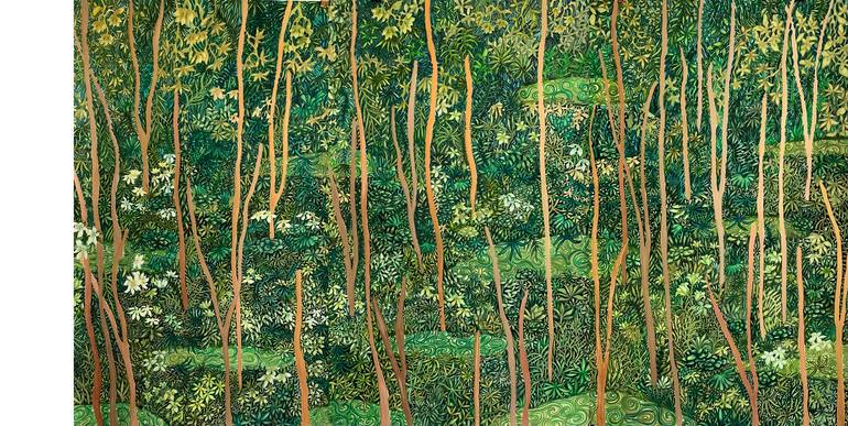 A triptych showing decorative woods with a textile energy. Mainly greens with gold for the trees for a slight magical feel.