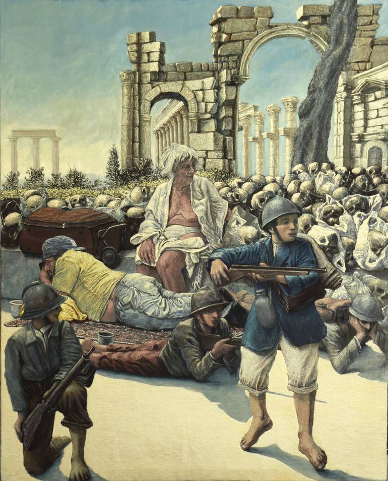 Working into Palmira oil on canvas, cm. 169.5 x 133.5. 2018 The painting depicts some boys working as soldiers in the First World War. An old lady and a homeless are witnesses. The scene takes place in the ancient city of Palmira in Syria. Every boy takes a different action. it's part of the "Work"...