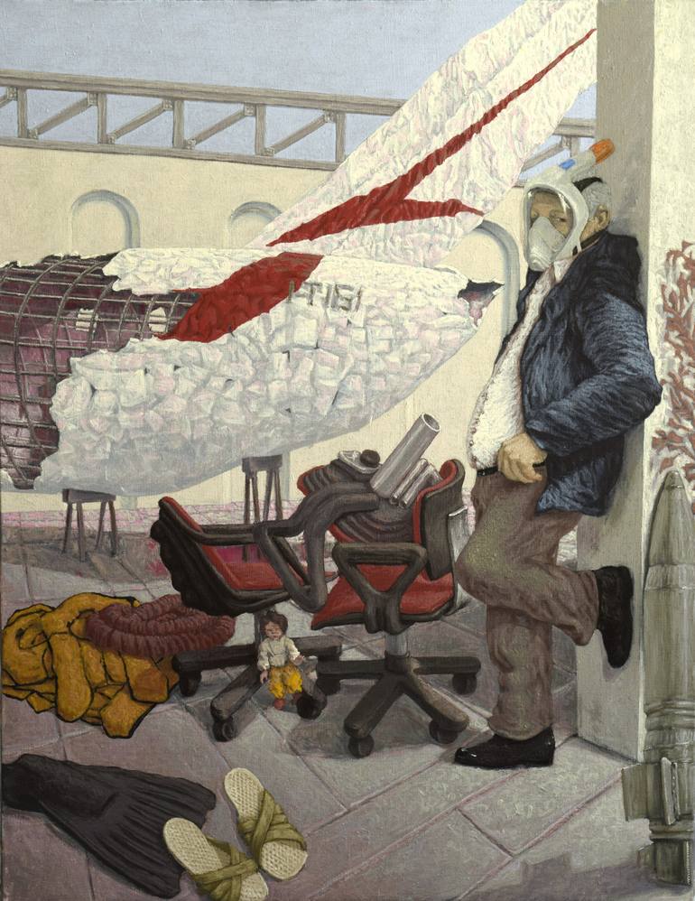 In a hangar lies the wreck of an airplane showing its skeleton like that of a beached whale. A man watches us with a missile next to him and at his feet personal items for a summer at the beach. The hangar no longer has a roof and a warm, searching light illuminates the scene. The work is inspired b...