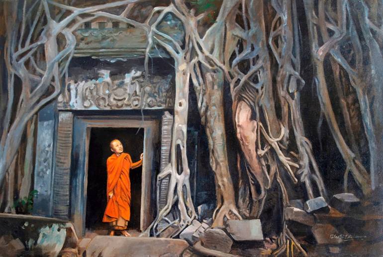 It was beautiful to watch, the roots of the tree wrapped itself around the building. A young priest observes it in amazement. The painting is lovely; the artist has portrayed works of nature so naturally. The creation is colored in shades of brown and grey, only the priest is in color, a bright oran...