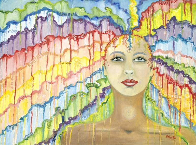 She represents world peace. The words for peace for many nations are weaved throughout her hair. She is in a meditative pose with her focus on her third eye. Her hair is out of control and dripping and vibrating with colors and energy.