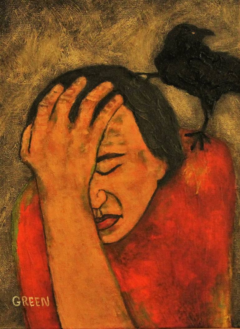 This painting consists of layer upon layer of semi-transparent glazes to achieve the richest quality of colors. Psychological, symbolic imagery combining old master techniques with contemporary design.