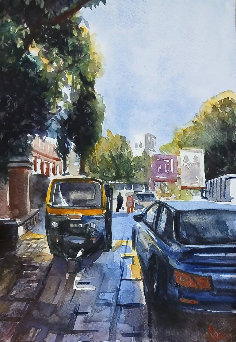 This dynamic painting of an autorickshaw coming down the wrong side of the road as photographed by me on a morning walk captures the essence of the Indian city. The cool foreground invites the viewer into sunlit foreground; the different directions in which the vehicles move bring tension and momen...