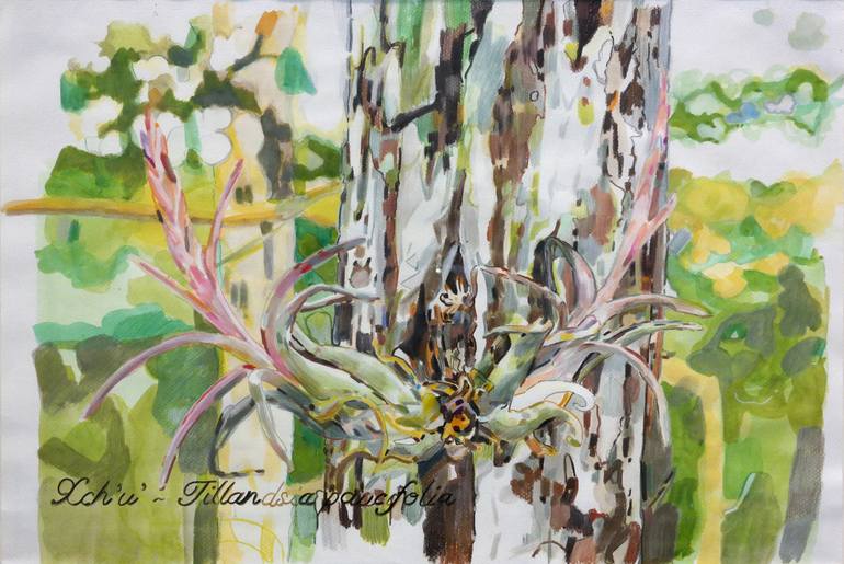A watercolor and color pencil depiction of Tillandsia paucifolia