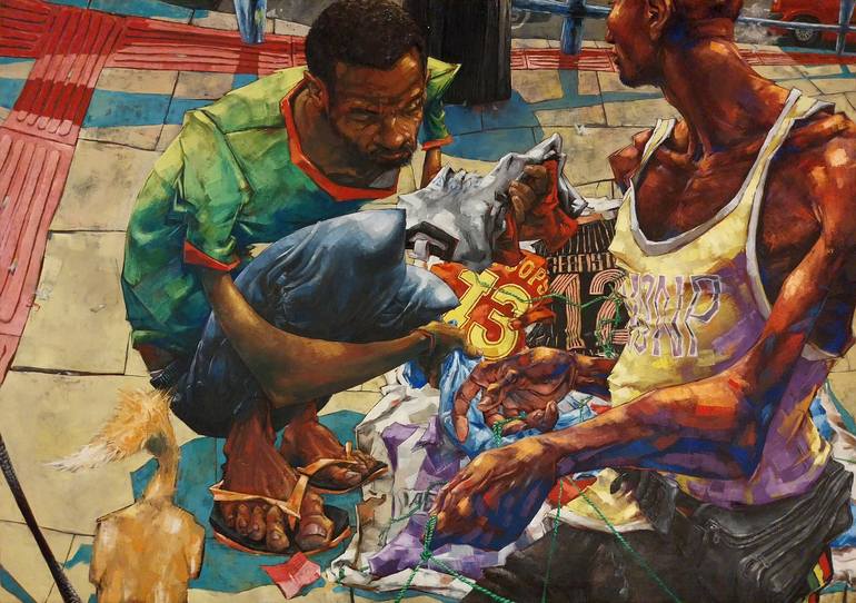 BIPOC street vendors have became a common view in everyday life at most Spanish cities, the only way, although a pretty precariosu one, of making a living for many refugees (mostly Africans, but also Arabs, Latino or Indopakistani people). This painting tires, somehow, to stand as a humble vindicati...