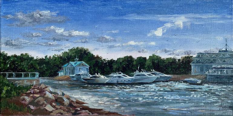 This painting was created on plein air in August 2020. The scene captured is a view on the Yacht Club on the Gulf of Finland, an ultimate spot for the summer activities for St. Petersburg citizens and tourists alike.