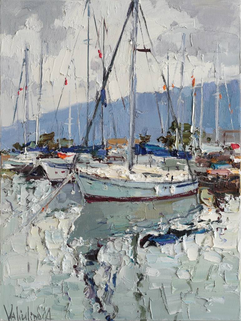 Original oil painting "Yachts at Rest" captures a peaceful harbor scene with sailboats gently floating on calm waters. I used a palette knife to create rich texture, emphasizing the movement of reflections and the softness of the cloudy sky. The muted blues, greens, grays, and whites bring a sense o...