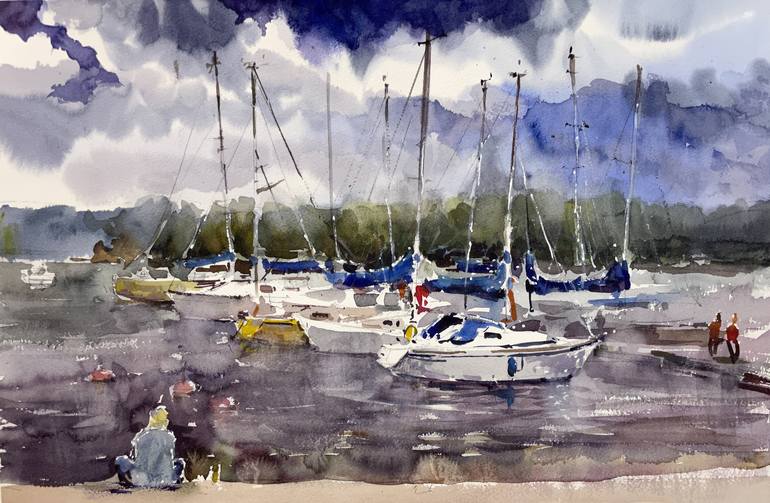 Watercolor on paper 22 x 14.9 inch (56 x 38 cm) "Yachts docked at a pier" is an original artwork created on location during a plein-air session in the summer of 2018. Ships, yachts, and boats are among my favorite subjects to paint. They offer rich histories, diverse designs, and showcase exciting ...