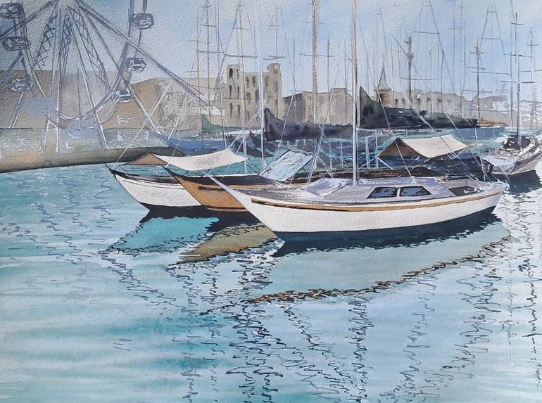 Yachts in Port Vell Barcelona Spain. A recent trip to Barcelona inspired me to write this painting. This watercolor painting was made to order. Work written in septembre 2022 in Catania Sicily Italy The watercolor is written on special professional cotton paper with a density of 300 g/m I am very c...