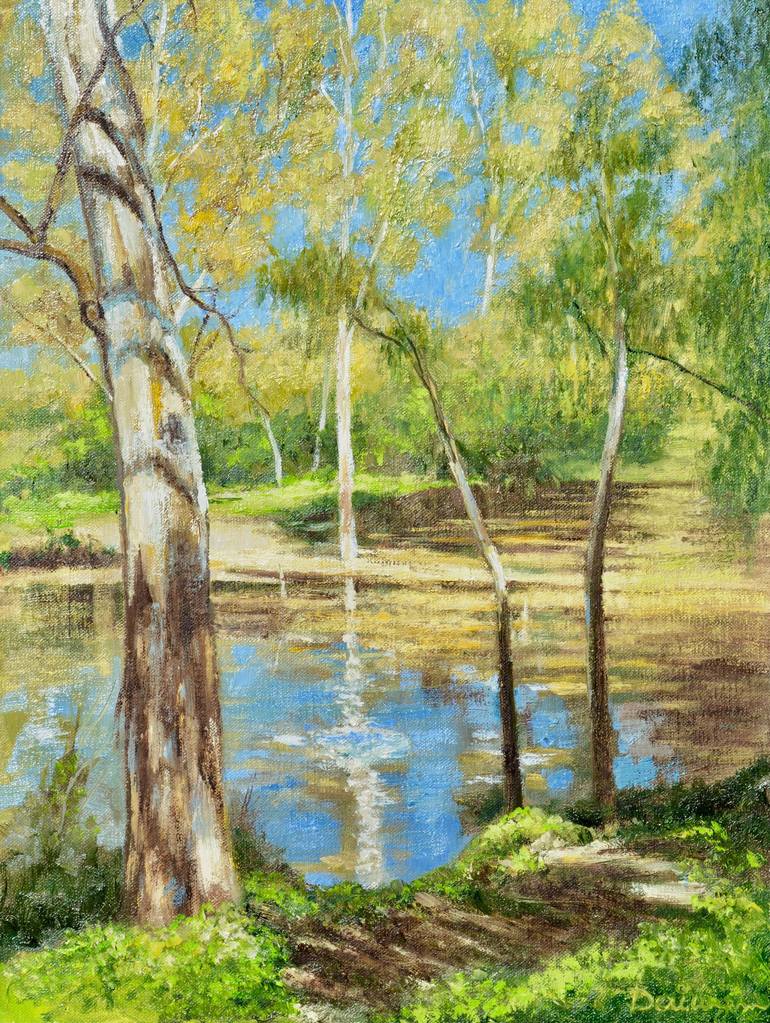 Shafts of afternoon spring sunshine light the muddy waters of Melbourne’s Yarra River at Eaglemont. Good spring rains have caused the river to flood, although still within its banks. Oil painting on rough weave linen on board. 40.6cm high by 30.5cm wide by 0.3cm deep approximately.