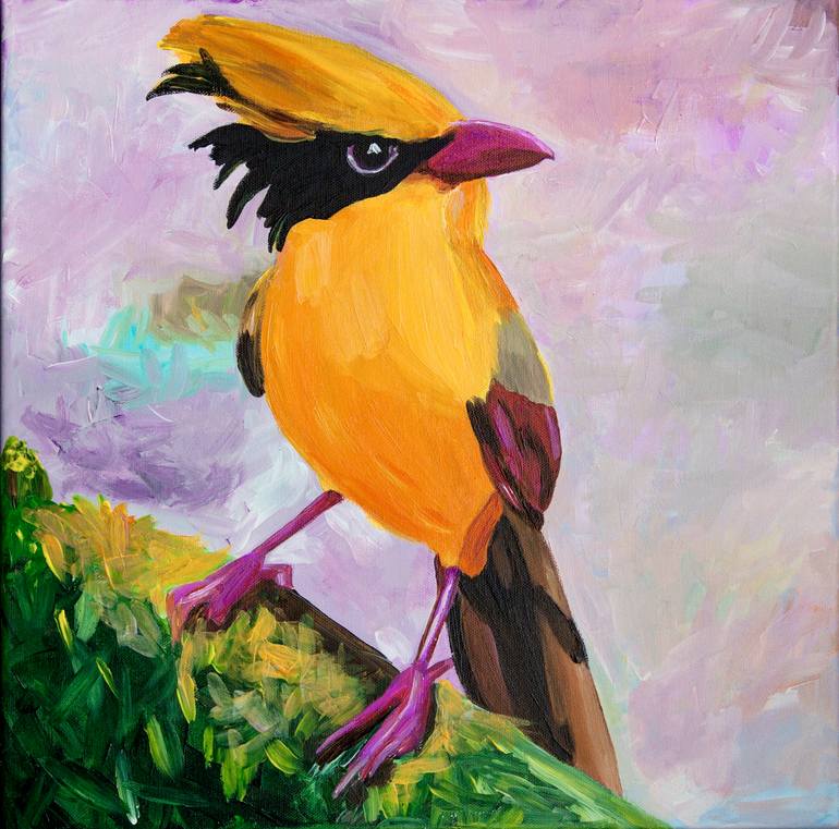 A bright, exotic bird is depicted on a 40×40 cm square canvas, painted with acrylics. Its plumage captivates the viewer with vivid shades of yellow, black, and burgundy. The most striking feature is the crested head with a contrasting mask around the eye — this detail gives the bird a charismatic an...