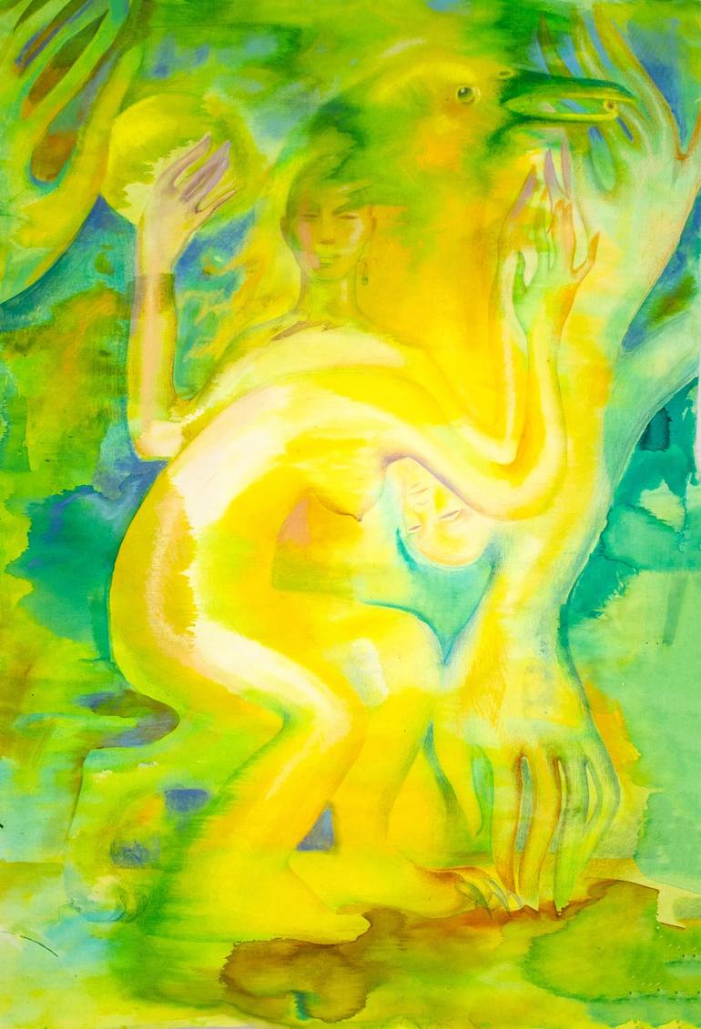 Yellow Goddess Dancing With Bird. Yellow and Green. Painting