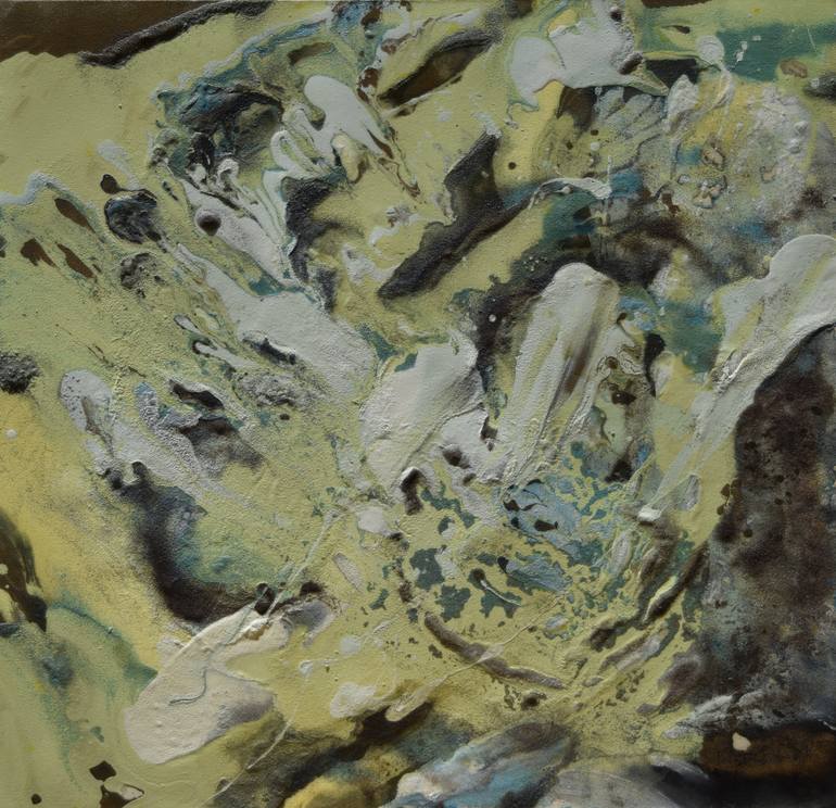 Yellow Mist has thick layers of paint and sand on canvas. It is coated with a semi-gloss finish. The sides are painted continuously and it is ready to hang. I think I was thinking of the beach when I created it. I like the color yellow. I find it uplifting.