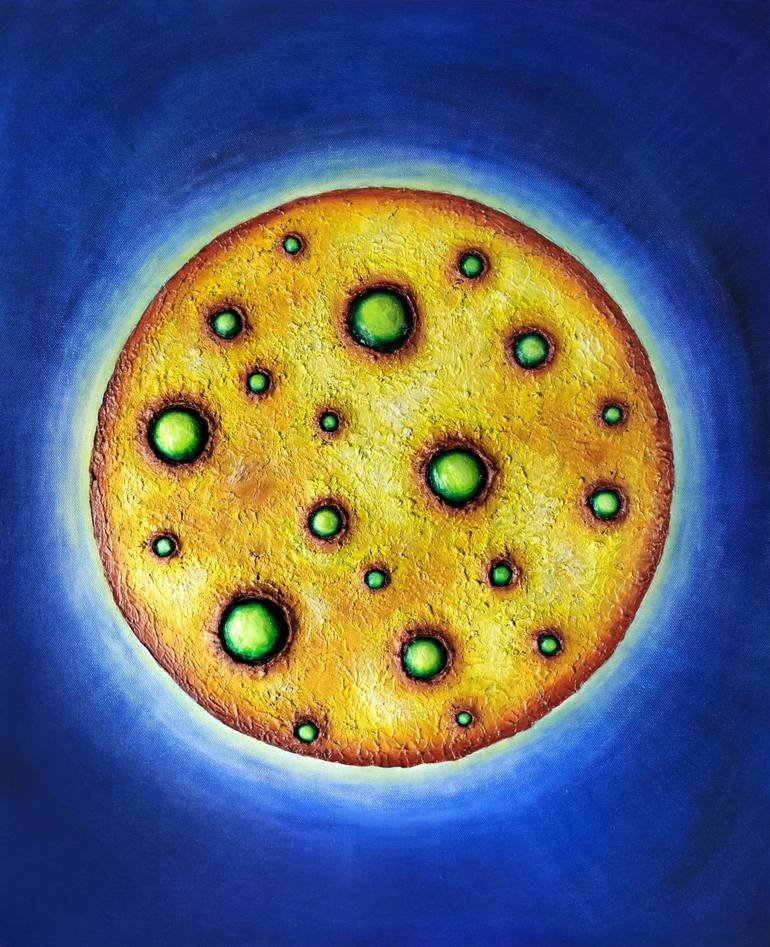 Yellow Moon is a striking textured oil painting depicting an otherworldly vision of the moon. The luminous yellow surface is enhanced with rich textures created using modeling paste, giving the piece a tactile, almost sculptural quality. Green glowing spheres fill the moon’s craters, adding an intri...