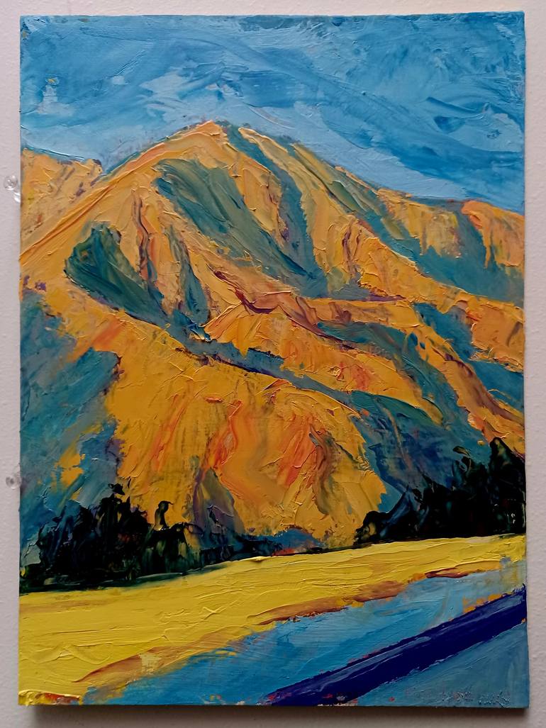 "Yellow Roof and Beyond" captures a sun-drenched view of the San Gabriel Mountain foothills north of Pasadena. Painted en plein air, the scene is rendered with expressive brushstrokes and a vibrant palette, characteristic of both Impressionism and Expressionism. The titular yellow roof anchors the c...