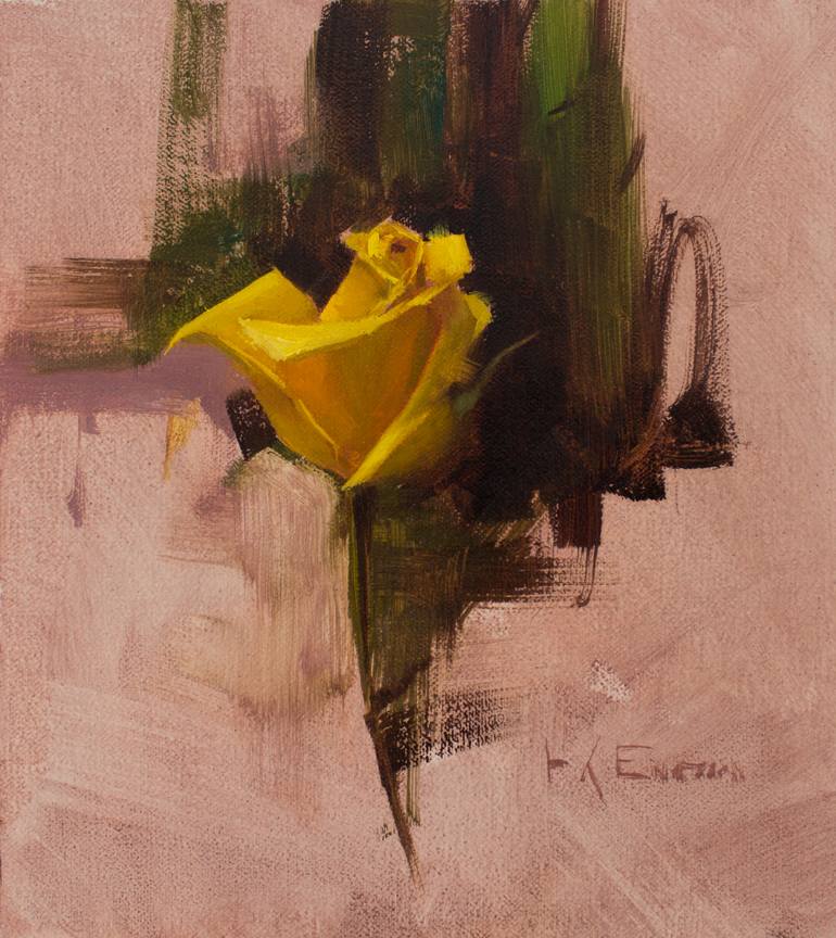 I wanted to capture the rose as honestly as I could. The background is simply designed to balance out the painting. I used a transparent wash of Terra rosa and Ultramarine blue to give a very toned down purple to counter the yellow in the flower. I was very surprised to notice how much green there w...