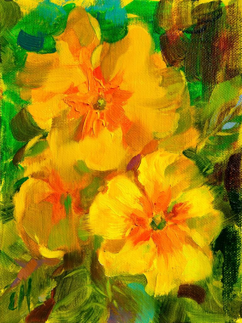 A simple painting of yellow viola flowers, created alla prima. The piece captures the brightness and warmth of the flowers with vivid and bold strokes, celebrating the beauty of their natural form. The lively yellow and orange tones bring a burst of color to the artwork. This is an original oil pai...