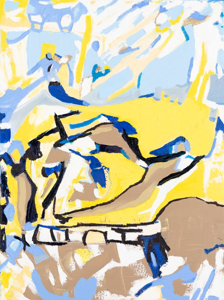 Gestural mark-making and the resulting shapes inspired this painting. it tells a story of pursuit.