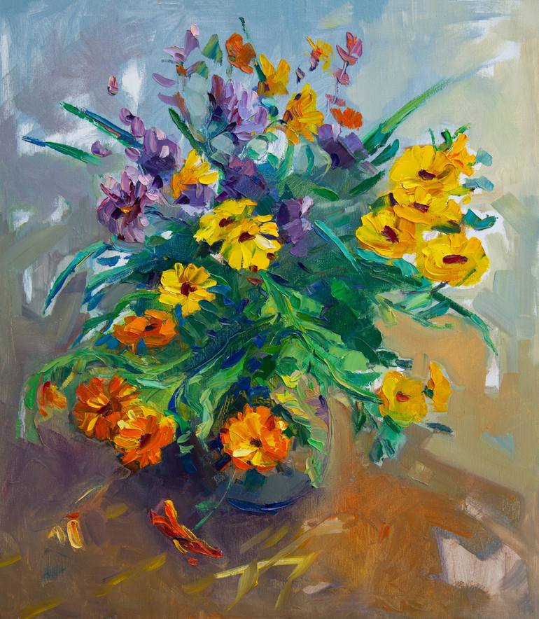 Yellow calendula flowers and violet flowers create very expressive contrast and the same time harmonia, I liked that bouquet very much. I painted this Artwork in expressionism stile with brushes and pallete knifes with thick layers of oil colors. The painting is on stretched canvas so us it is rea...