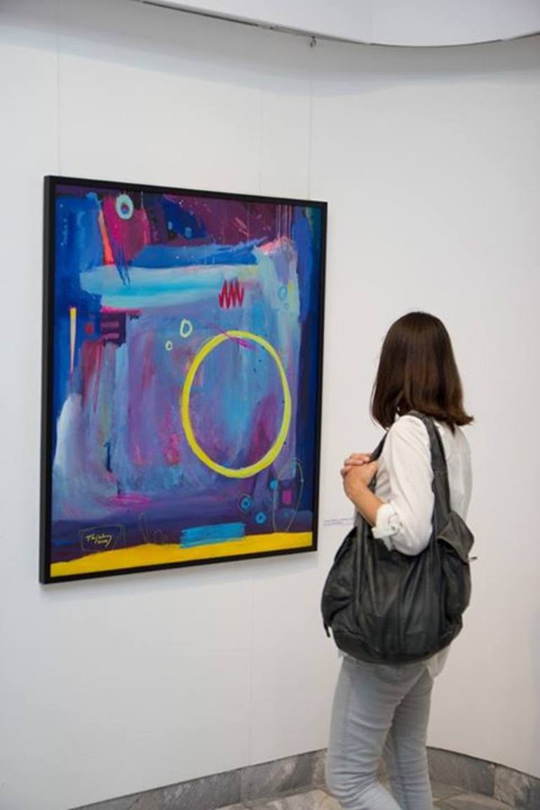 Yellow circle acylic on canvas 2014. signed front and back framed in black frame