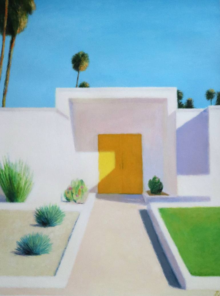 "Yellow door. Afternoon light" 24" X 18" acrylic/watercolor paper 2024. This painting is not framed. This painting was inspired by American mid-century modern architecture and beautiful Palm Springs,California.