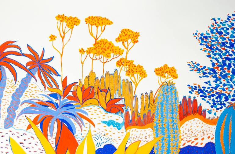 Vibrant Mediterranean landscape featuring bold cacti and sun-drenched yellow flowers, captured in striking primary colors. A celebration of nature's resilience and beauty under the bright Mediterranean sun