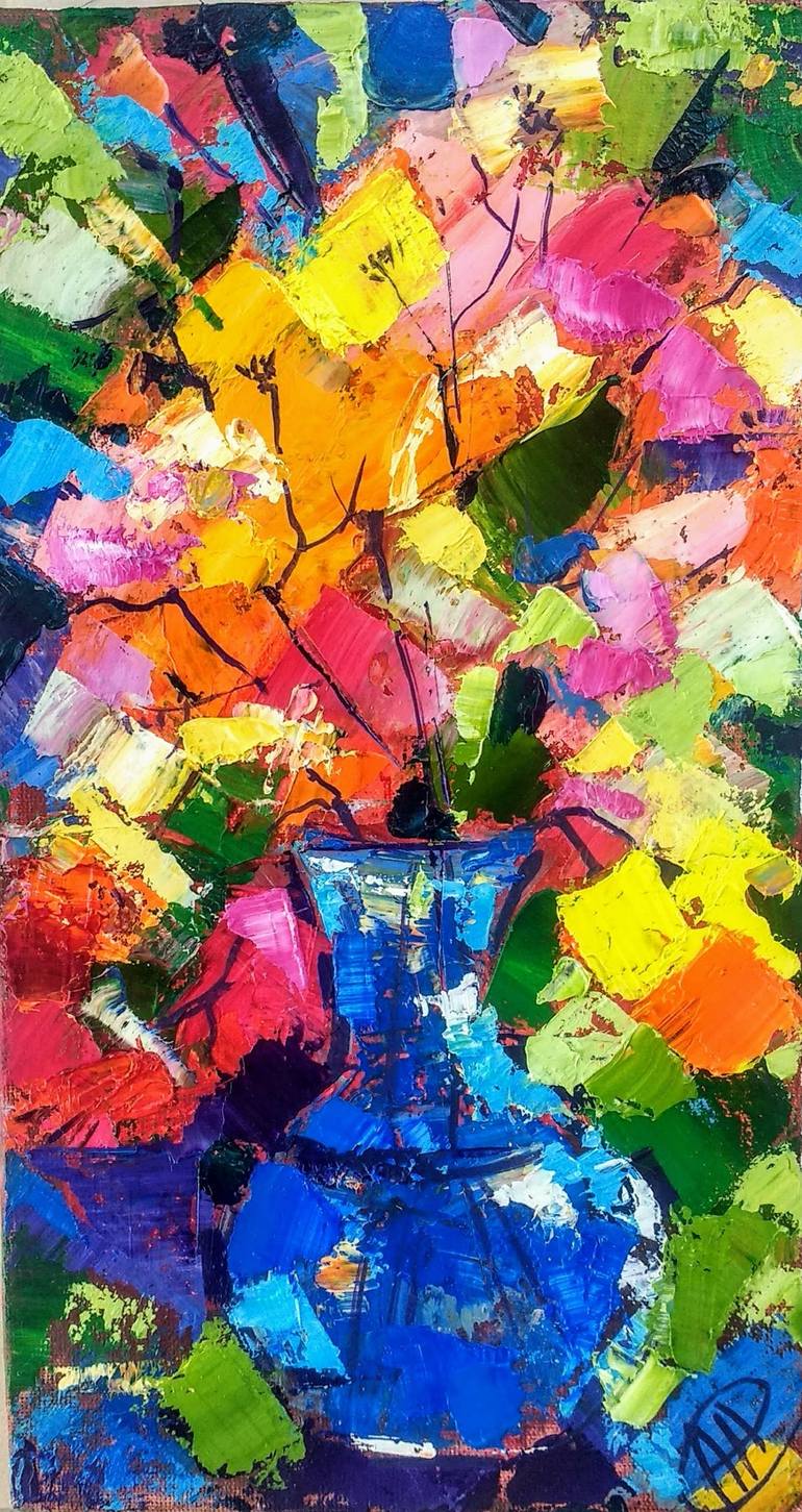 Abstract Floral oil painting impasto, orange flowers oil painting, yellow abstract bouquet in a blue vase 11.5" by 6.5" by SkorokhoArtLine Size of this Art : 11.5" X 6.5" 27.5cm X 19.6cm by SkorokhoArt 30cm X 16cm This is 100% original art, it's not a print or a copy! Beautiful Bright Bouquet,oran...