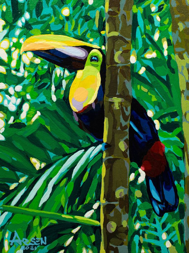 Emerald Oasis: A Yellow-Throated Toucan's Perch Immerse yourself in the dappled sunlight filtering through the Costa Rican rainforest in this impressionistic masterpiece. A vibrant yellow-throated toucan takes center stage, perched regally on a palm stalk. Loose brushstrokes of emerald green captu...