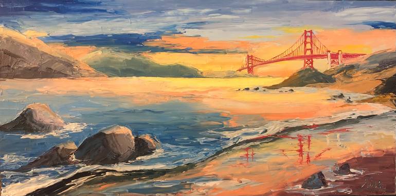This is the view of the Golden Gate bridge from Baker Beach as the sun sets in San Francisco. The ocean waves rock back and forth, adding ambiance and beauty to this immaculate landscape.